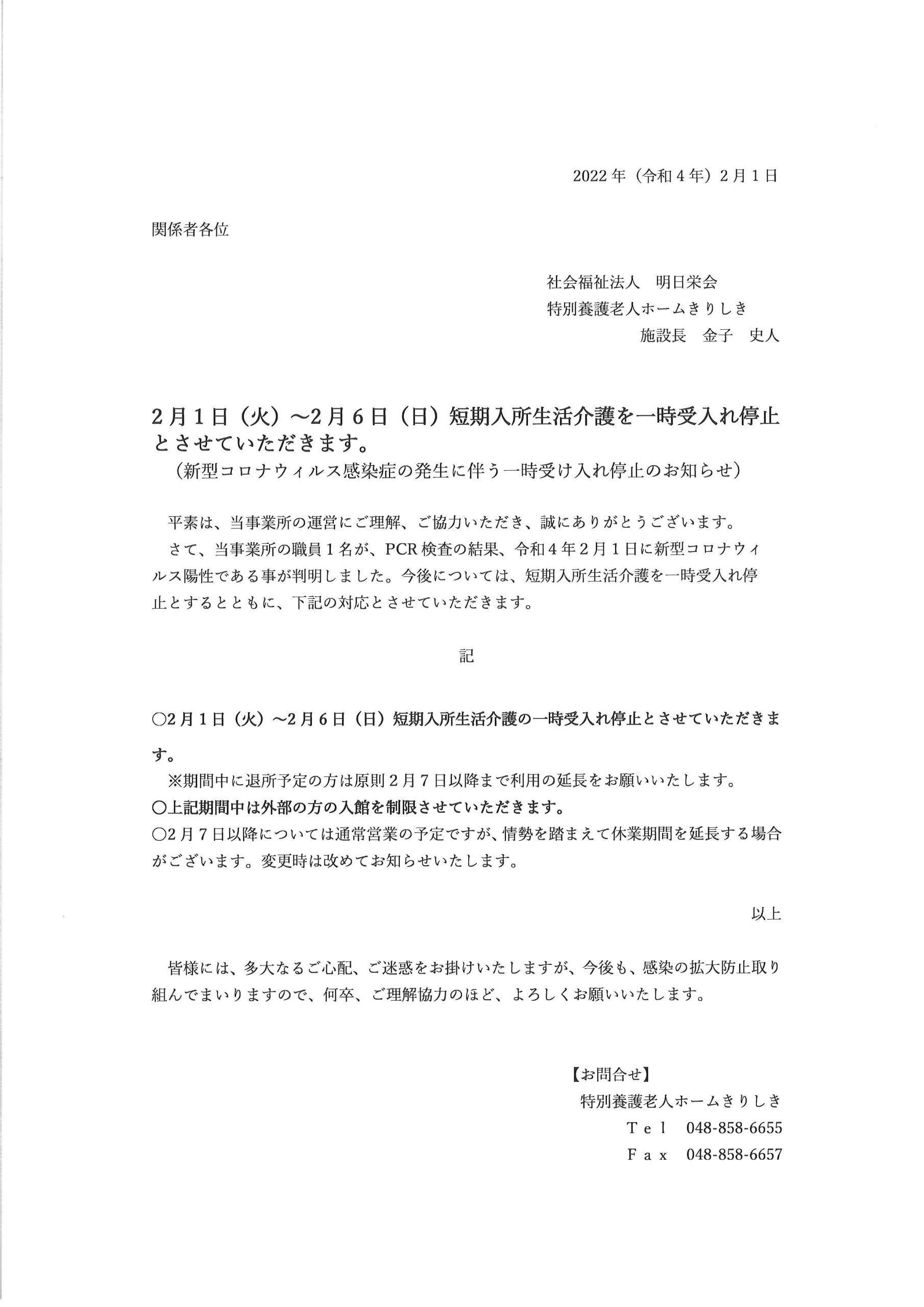 新型コロナウイルス感染症発生及び短期入所生活介護の一時受け入れ停止に関して(第1報)
