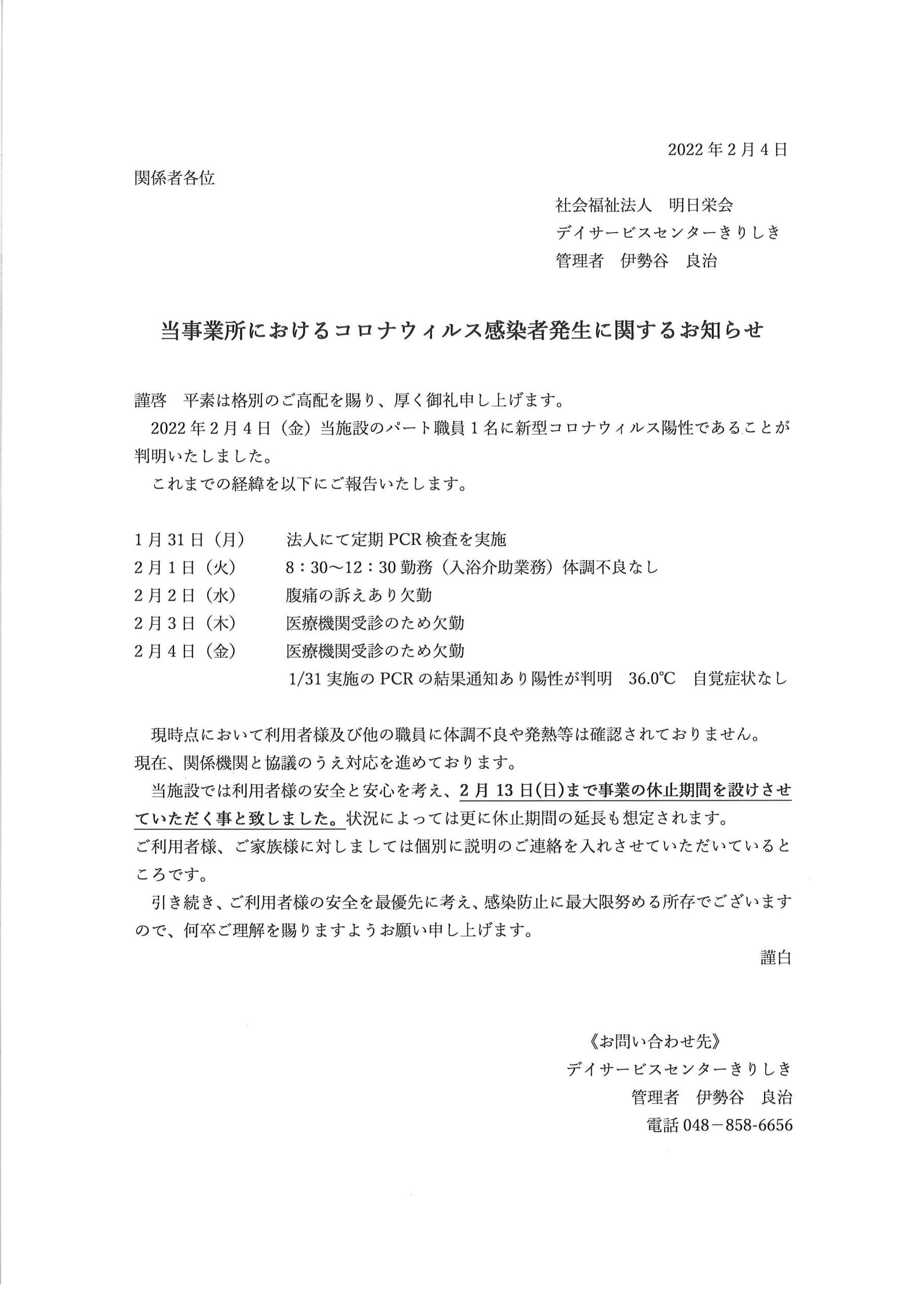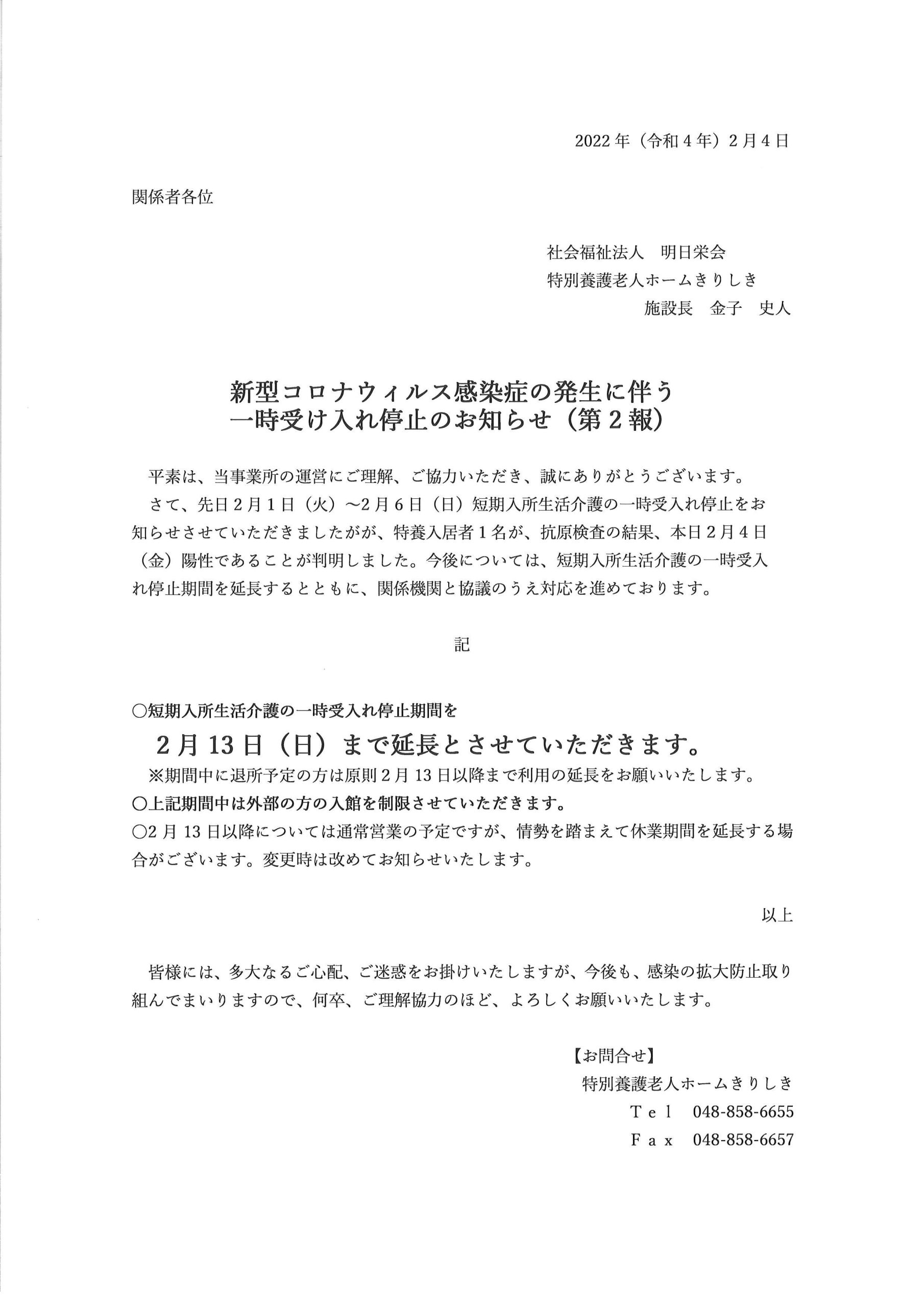 新型コロナウイルス感染症発生及び通所介護(デイサービスセンターきりしき)の臨時休業に関して(第1報)短期入所生活介護の一時受け入れ停止延長に関して(第2報)