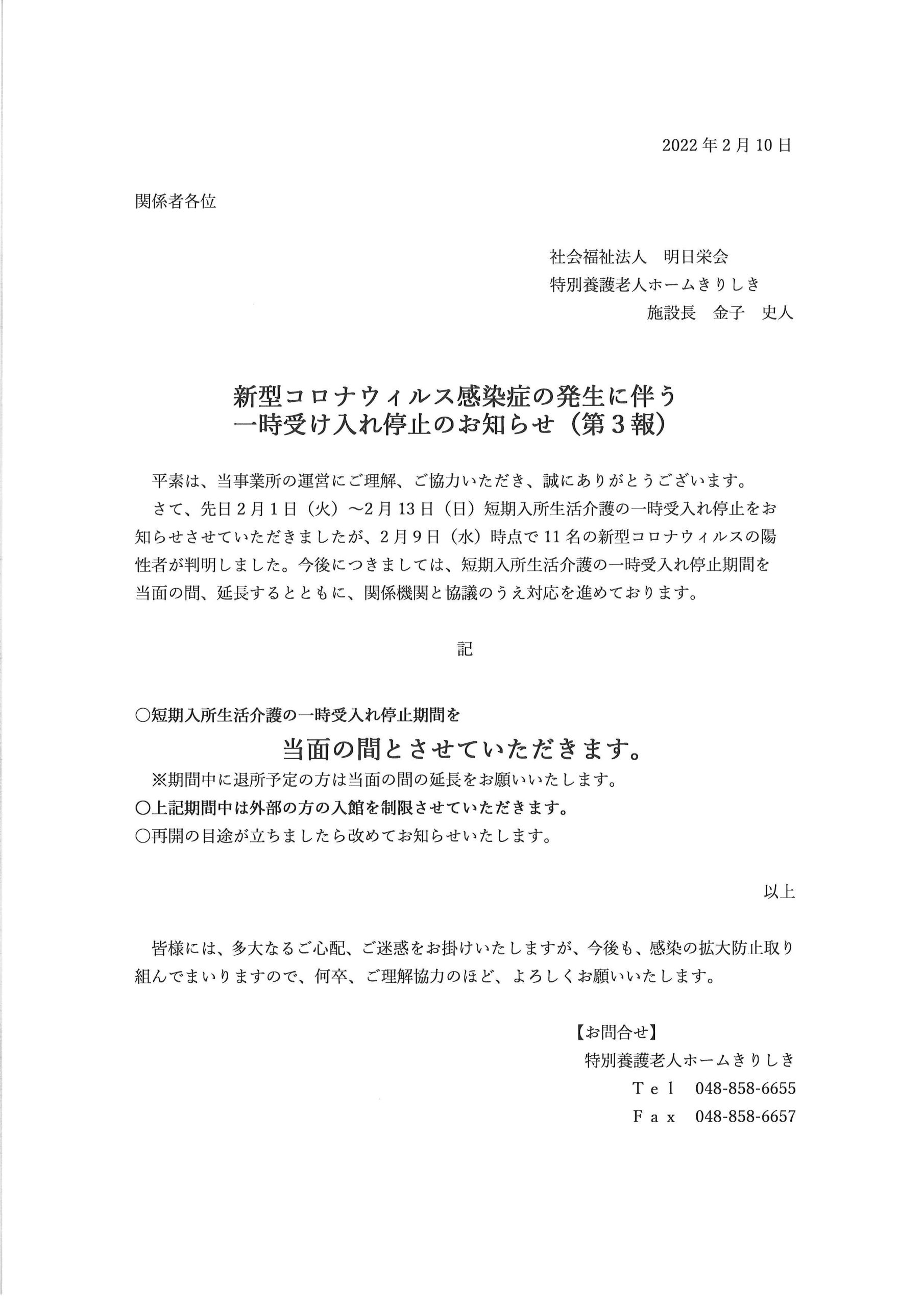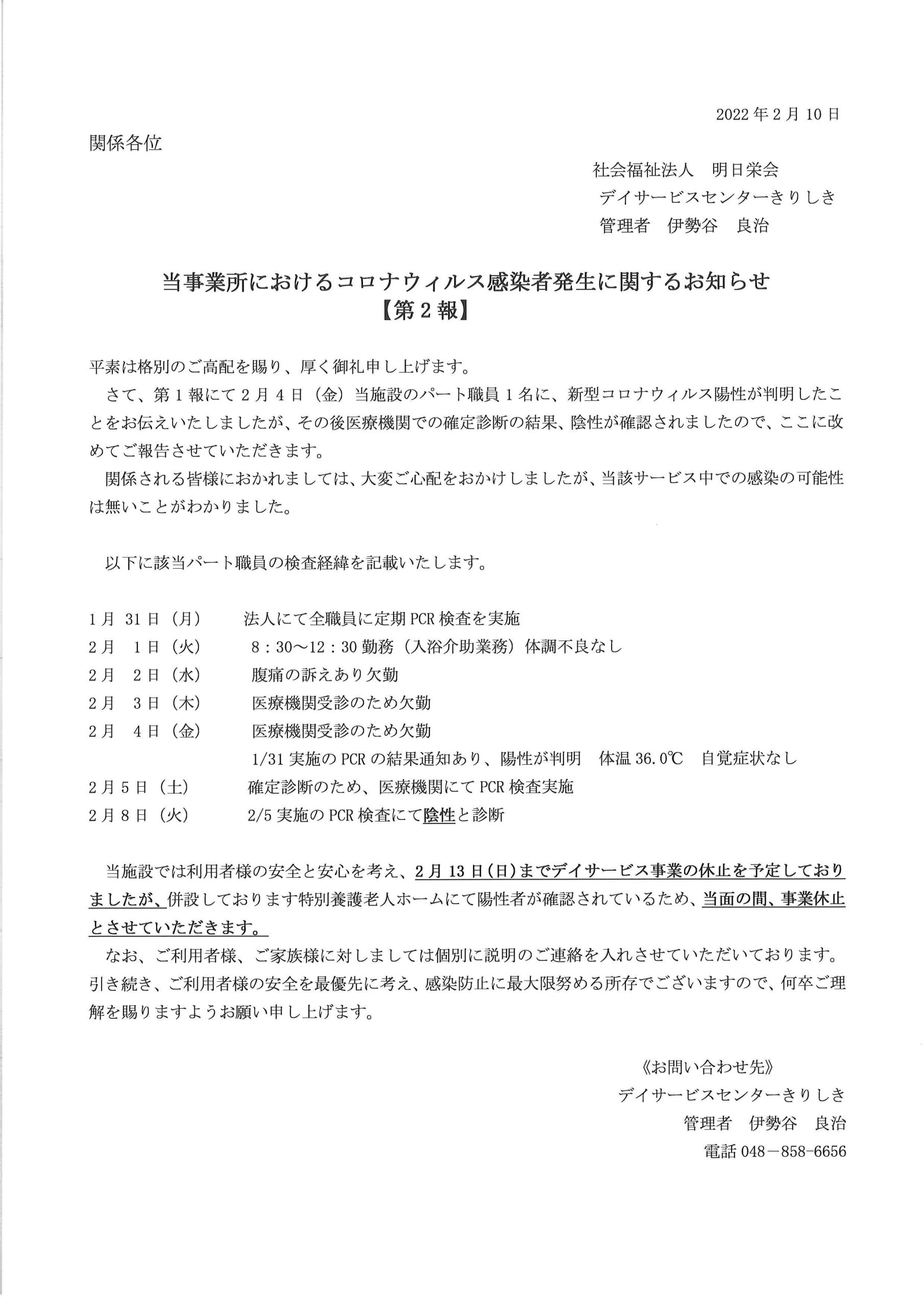 新型コロナウイルス感染症発生及び通所介護(デイサービスセンターきりしき)の臨時休業に関して(第2報)短期入所生活介護の一時受け入れ停止に関して(第3報)